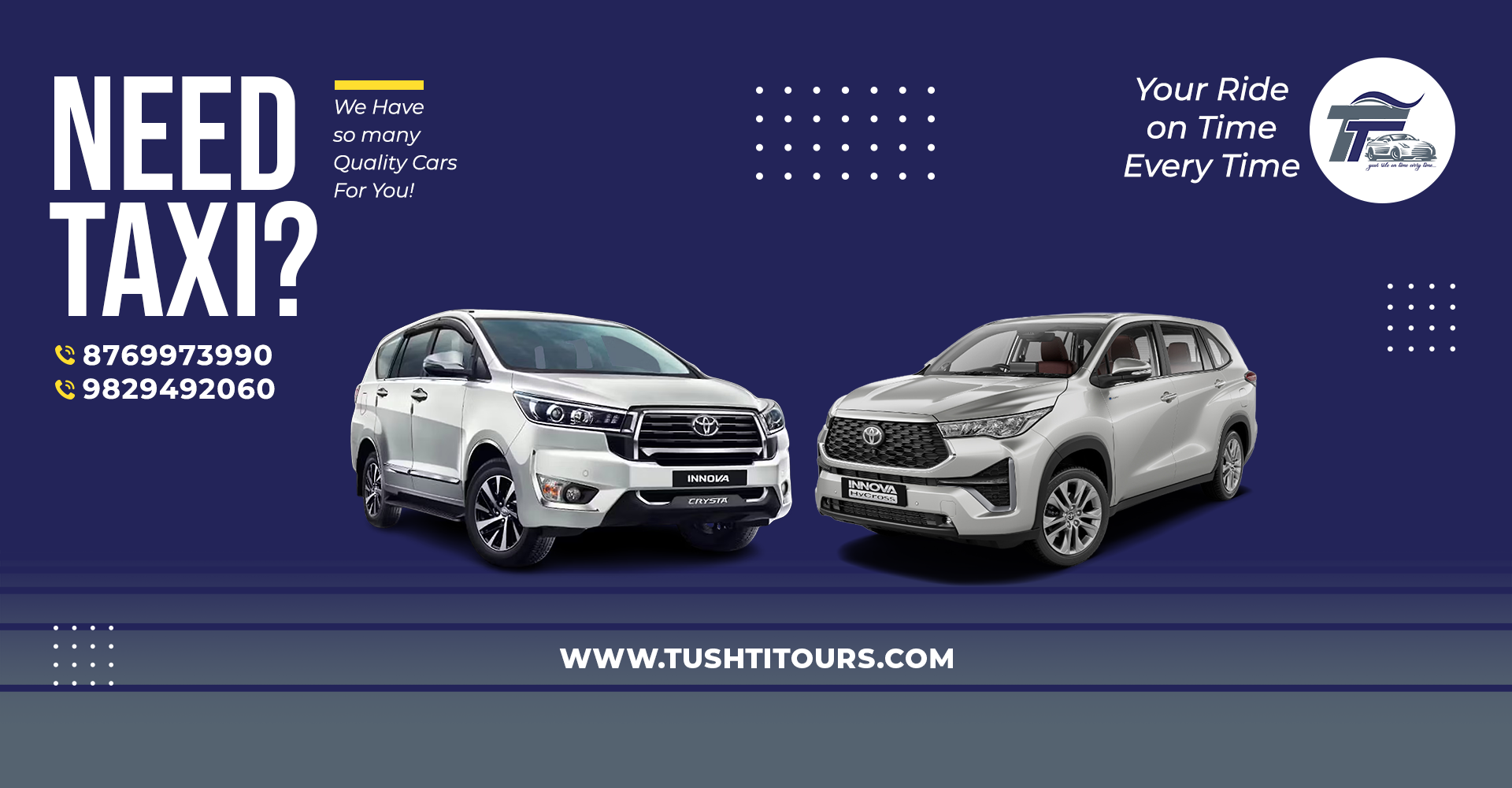 Explore Udaipur or travel beyond with ease. Book local or outstation taxis instantly via www.tushtitours.com or call us at 8769973990, 9829492060 —comfortable, driver-accompanied rides, always.