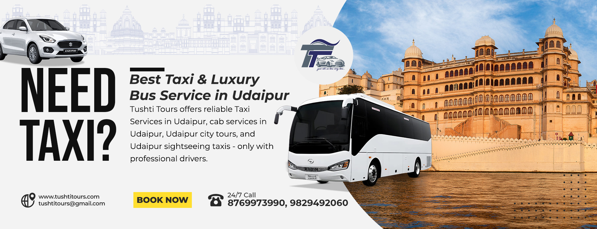 Looking for affordable and reliable taxi services in Udaipur? Tushti Tours offers the best taxi fares per km in Udaipur, ensuring comfort, safety, and value on every ride. You can easily book your taxi online through our website, or contact our support team at 8769973990 for details about our custom cab packages and local sightseeing trips.